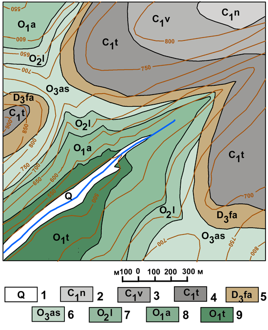 Рис. к-1.3. Карта 1. Условные обозначения: 1 – четвертичная система, галечники и пески; каменноугольная система, нижний отдел; 2 – намюрский ярус, алевролиты и аргиллиты 3 – визейский ярус, мелкозернистые песчаники; 4 – турнейский ярус, крупнозернистые пудинговые песчаники и галечники; 5 – девонская система верхний отдел, фаменский ярус, валунники; ордовикская система: 6 – верхний отдел, ашгильский ярус; известняки; 7 – средний отдел, лландлейский ярус; литокластические туфы липаритового состава; нижний отдел 8 – аренигский ярус; андезит-базальты, 9 – тремадокский ярус, кремнистые сланцы.