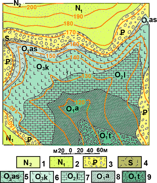 Рис. к-1.4. Карта 2. Условные обозначения: неогеновая система; 1 –плиоценовый отдел, глины; 2 – миоценовый отдел; известковистые песчаники; 3 – палеогеновая система; конгломераты; 4 – силурийская система; липариты; ордовикская система верхний отдел 5 – aшгильский ярус; туфопесчаники; 6 – карадогский ярус; базальты; 7 - лландлейский ярус известняки; нижний отдел; 8 – аренигский ярус; песчаники, алевролиты; 9 – тремадокский ярус; туфоконгломераты.