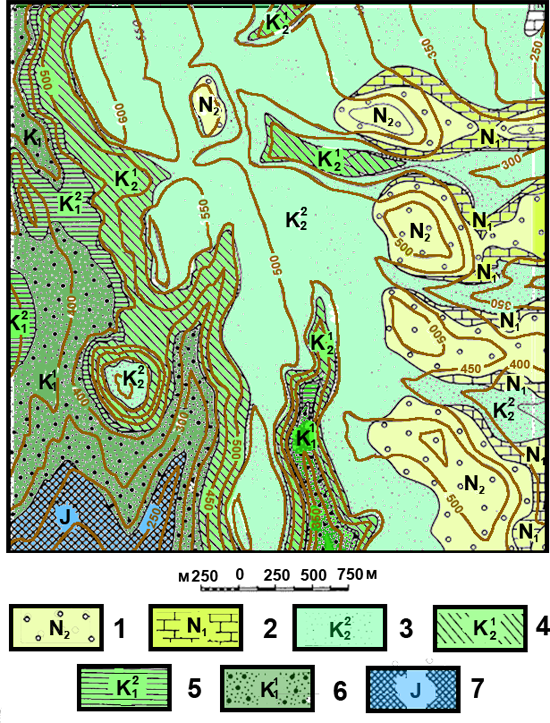 Рис. к-1.5. Карта 3. Условные обозначения: неогеновая система 1 – плиоценовый отдел, известковистые песчаники; 2 – миоценовый отдел; пелитоморфные известняки; меловая система верхний отдел 3 – верхняя пачка – криноидные известняки; 4 – нижняя пачка – мергели; нижний отдел 5 – верхняя пачка – известняки; 6 – нижняя пачка – песчанистые мергели; 7 – юрская система верхний отдел – глауконитовые песчаники.