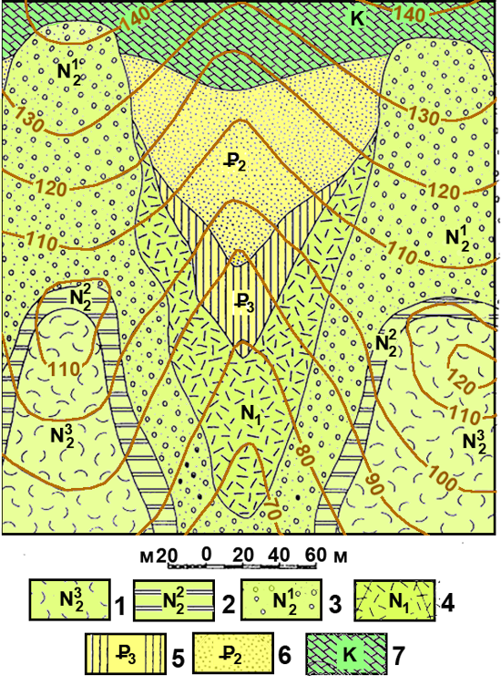 Рис. к-1.6. Карта 4. Условные обозначения: Неогеновая система, плиоценовый отдел, 1 – верхняя пачка; трепелы; 2 – средняя пачка; песчанистые мягкие мергели, 3 – нижняя пачка – кварцевые песчаники; 4 – миоценовый отдел; туфогенные песчаники. Палеогеновая система 5 – олигоценовый отдел известковистые глины; 6 – эоценовый отдел; глауконитовые пески; 7 – меловая система, верхний отдел, глауконитовые мергели.