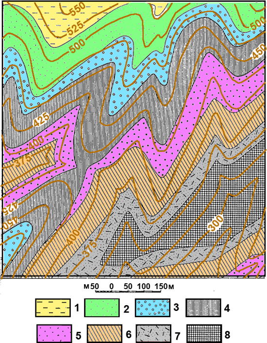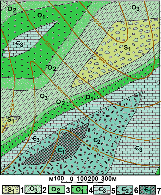Рис. к-1.10. Карта 8. Условные обозначения: 1 – силурийская система; нижний отдел, конгломераты. Ордовикская система: 2 – верхний отдел, песчаники, алевролиты с линзами известняков, 3 – средний отдел, песчаники и алевролиты; 4 – нижний отдел песчаники и гравелиты. Кембрийская система: 5 – верхний отдел, известняки, 6 – средний отдел, дациты, 7 – нижний отдел, кремнистые сланцы.