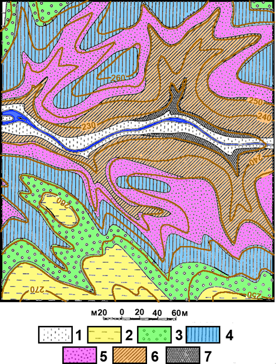 Рис. к-1.8. Карта 6. Условные обозначения: 1 – глауконитовые пески с линзами глин; 2 – супеси и суглинки с дресвой, 3 – галечники с линзами суглинков, 4 – органогенные известняки, 5 – аллювиальные известняки и супеси с галькой, 6 – глины с прослоями песков, 7 – пелитоморфные известняки.