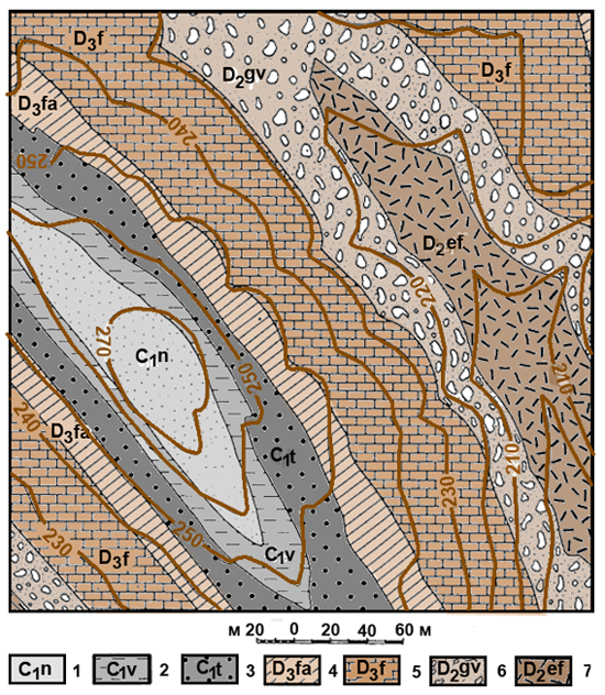 Рис. к-1.9. Карта 7. Условные обозначения: каменноугольная система, нижний отдел 1 – намюрский ярус, песчаники; 2 – визейский ярус, аргиллиты 3 – турнейский ярус, пудинговые песчаники. Девонская система, верхний отдел, 4 – фаменский ярус, алевролиты, 5 – франский ярус, доломитовые известняки, средний отдел 6 – живетский ярус песчаники и конгломераты, 7 – ейфельский ярус, липариты.