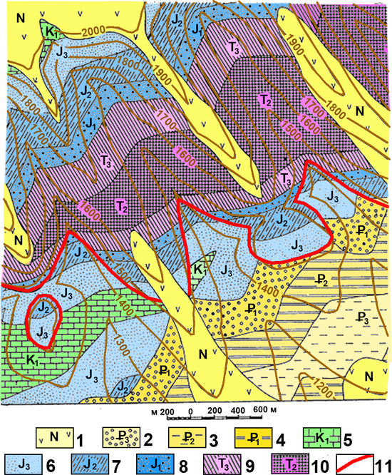 Рис. к-1.13. Карта 11. Условные обозначения: 1 – неогеновая система, андезиты. Палеогеновая система 2 – олигоценовый отдел, глины, 3 – эоценовый отдел, песчаники и алевролиты, 4 – палеоценовый отдел, конгломераты, 5 – меловая система, нижний отдел, известняки. Юрская система 6 – верхний отдел полимиктовые песчаники, 7 – средний отдел – алевролиты и аргиллиты, 8 – нижний отдел, полимиктовые песчаники и гравелиты, триасовая система 9 – верхний отдел, туфоалевролиты, 10 – средний отдел, диабазы 11 – разрывные нарушения.