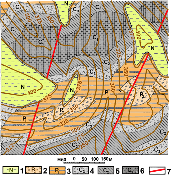 Рис. к-1.14. Карта 12. Условные обозначения: 1 – неогеновая система, плотные известковистые аргиллиты. Пермская система 2 – верхний отдел отдел, конгломераты, 3 – нижний отдел алевролиты и мелкозернистые песчаники. Каменноугольная система 4 – верхний отдел, туффиты и туфы кислого состава, 5 – средний отдел, глинистые сланцы, 6 – нижний отдел, известняки и доломиты. 7 – разрывные нарушения.