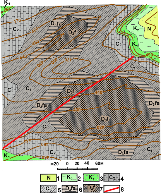 Рис. к-1.15. Карта 13. Условные обозначения: 1 – неогеновая система, плиоценовый отдел, пески, глины, меловая система 2 – верхний отдел, глинистые известняки, Меловая система 3 – нижний отдел, известковистые песчаники. Каменноугольная система, нижний отдел 4 – намюрский ярус, аргиллиты, алевролиты, песчаники, 5 – визейский ярус, мергели с прослоями известняков, 6 – турнейский ярус, мергели с прослоями известняков. Девонская система, верхний отдел 7 – фаменский ярус, пелитоморфные известняки, 8 – франский ярус, красноцветные песчаники, 8 – разрывные нарушения.