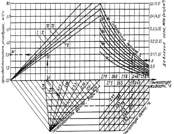 Номограмма для определения производительности резервуара сжиженного газа вместимостью 2,5 и 5 м3 (подземного) I - резервуар 5 м3, заполнение 85 %; II - резервуар 5 м3, заполнение 50 %; III - резервуар 5 м3, заполнение 35 % и резервуар 2,5 м3, заполнение 50 %; IV - резервуар 2,5 м3, заполнение 85 %; V - резервуар 2,5 м3, заполнение 35 % Пример. Дано: давление газа - 0,04 МПа (0,4 кгс/см2); содержание пропана С3Н8 - 60 %; температура грунта - 270 К; теплопроводность грунта - 2,33 Вт/ (мк); заполнение 35 %. Находим: производительность резервуара - 2 м3/ч по линии А-С-В-Г-Д-Е-Ж. 9.13. Для резервуарных установок следует применять стальные сварные резервуары цилиндрической формы, располагаемые горизонтально. Установку подземных резервуаров следует выполнять в соответствии с требованиями разд. 8. Резервуары, предназначенные для подземной установки, надземно устанавливать не разрешается. 9.14. Защиту подземных резервуаров от коррозии следует предусматривать в соответствии с требованиями ГОСТ 9.602-89 и указаниями разд. 4. Надземные резервуары необходимо окрашивать в светлый цвет. Таблица 22