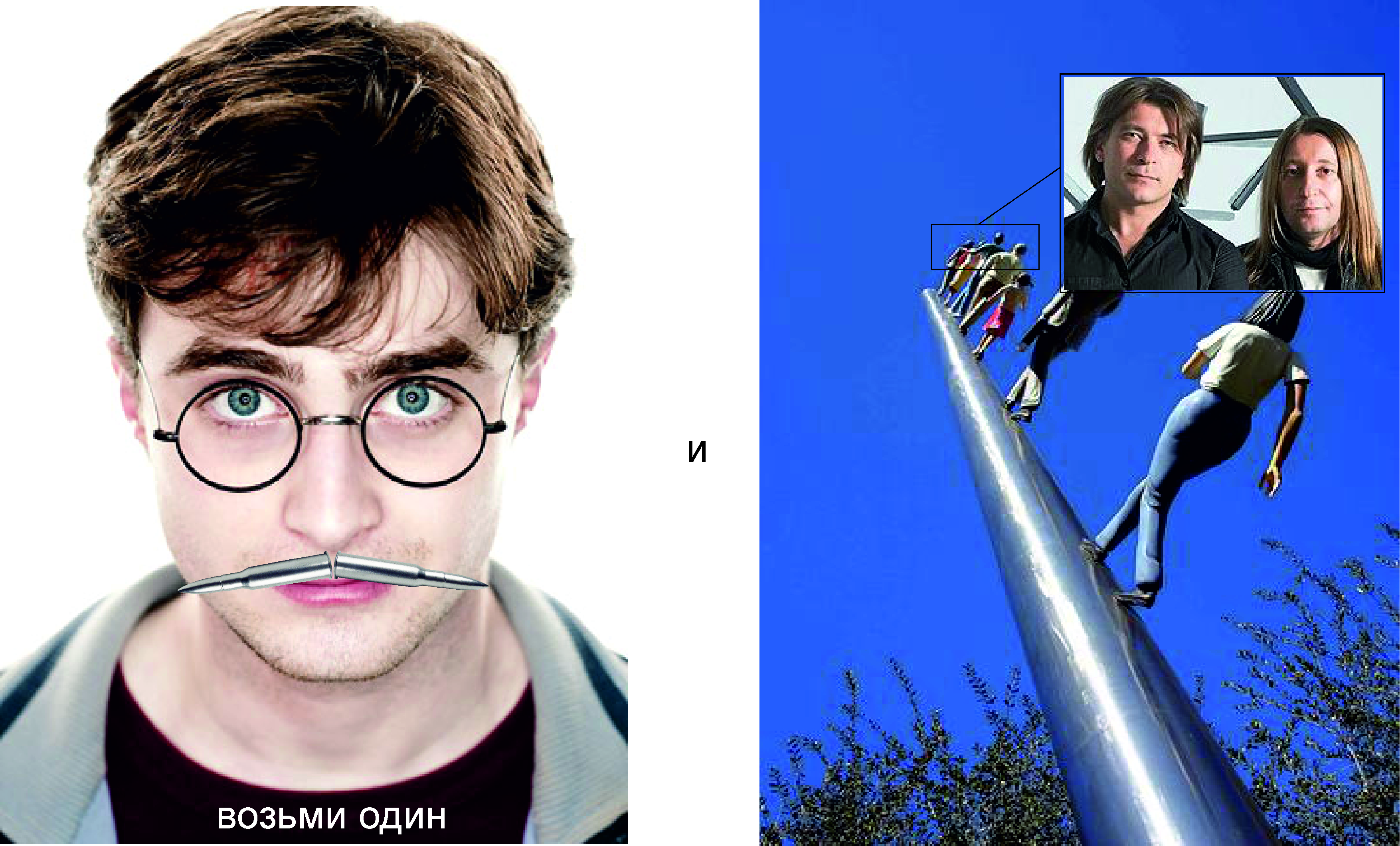 ЛОГИКА ЗАДАНИЯ: Картинка слева: Усы-патроны, берём один, ус-патрон, патрон-ус, патронус. Так как усы-патроны изображены на Гарри Поттере, то ищем патронус Гарри Поттера. У него патронус – олень. Картинка справа: Изображены люди, уходящие в небо, эти люди – Би-2. У группы Би-2 есть песня «Волки уходят в небеса». Для тех, кто не знаком с этой песней: на любой запрос типа «Би-2 уходят в небо» гугл сразу выдаёт «Волки». Складывая картинки воедино получаем скульптуру «Олень и волки».