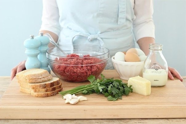 · Говяжий фарш – 500 г · 2 куска батона · Чеснок – 2 зубчика · Свежая рубленая петрушка · Тертый пармезан – ¼ стакана · Молоко – 2 столовых ложки · Яйцо – 1 шт · Соль и перец
