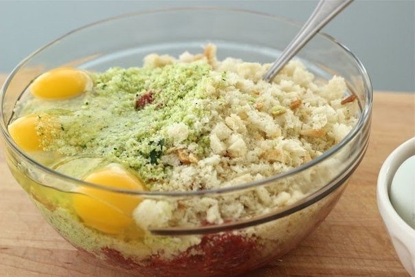 Добавьте пармезан и взбейте снова. Маленькими порциями добавьте кубики хлеба, затем фарш и в конце яйца, молоко, соль и перец. Нарежьте хлеб. Тертый сыр, выдавленный чеснок, нарезанную петрушку, соль и перец смешайте. Вбейте яйца и влейте молоко. Смешайте и в конце добавьте фарш. Перемешайте вилкой или руками.
