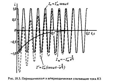 где Z в и Z н – сопротивления вторичной обмотки ТТ и подключенной к ней нагрузки. Как было показано в (8.3), при заданном значении тока I к и Е нас необходимо уменьшать нагрузку Z н ТТ и увеличивать коэффициент трансформации К I. Кроме того, при однотипных ТТ для выравнивания токов I Iнам и I IIнамнеобходимо выравнивать нагрузку обмоток ТТ, т.е. обеспечивать условие Z Iн = Z IIн, при котором Е Iв = Е IIв. В схеме с циркуляцией токов нагрузку каждого ТТ составляет сопротивление соединительных проводов от зажимов ТТ до ИО тока. Входное сопротивление ИО не учитывается, так как при внешних КЗ и других сквозных токах ток в нем отсутствует. Допустимые значения Z Iн и Z IIн, при которых ТТ работают в линейной части характеристики намагничивания, выбираются по кривым предельной кратности, обеспечивающим погрешность ТТ не более 10%. Такой режим работы ТТ и уровни небаланса могут быть обеспечены при соблюдении указанных выше условий в установившемся режиме КЗ. В переходном режиме I нам ТТ может во много раз превосходить значения установившегося режима, что влечет за собой резкое увеличение I нб. Токи намагничивания и небаланса в переходном режиме КЗ. При внезапном КЗ возникает переходный процесс, во время которого в токе КЗ I к (рис.10.3) кроме вынужденной периодической составляющей I к.п = I msin(ωt – 90°) появляется свободная апериодическая составляющая