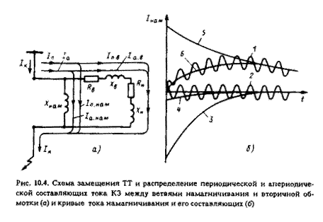 Дополнительное ухудшение работы ТТ вносит внезапное появление в замкнутом контуре цепи намагничивания и вторичной обмотки токов I п.нам и I а.нам (кривые 2 и 3), обусловленных составляющими тока КЗ I к.п и I к.а. Так как во вторичной цепи ТТ, содержащей индуктивности L нам, L в, L н (Х нам, Х в, Х н), ток изменяться скачком не может, то в начальный момент t = 0 в ветви намагничивания и во вторичной обмотке возникают свободные апериодические токи I св.п (кривая 4)и I св.в (кривая 5), компенсирующие в первый момент времени вынужденные составляющие I п.нам и I а.нам соответственно.