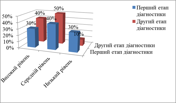 Рис.2.3. Динаміка розвитку самостійності дітей контрольної групи на різних етапах діагностики. На Рис.2.3. ми можемо простежити невелику динаміку розвитку мовлення дітей контрольної групи, високий рівень зріс на 10%, в порівнянні з першим етапом діагностики, а кількість дітей з низьким рівнем зменшилась на 10%. Тому, ми можемо впевнено сказати що наша робота з експерементальною групою проведена не дарма, бо як видно з діаграм остаточний рівень розвитку самостійності у експерементальної групи виявився вищим. В підсумок проведеного нами дослідження можемо порівняти динаміку розвитку експерементальної та контрольної груп. Результативність виконаної нами роботи можна побачити на графіку. (Рис.2.4.)