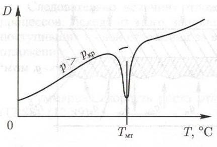Рис.1.3. Зависимость коэффициента диффузии вещества в водном теплоносителе при сверхкритическом давлении от температуры. Рассмотрим изменение температуры водного теплоносителя при сверхкритическом давлении по длине обогреваемой трубы в какой-то момент времени. На рис. 1.4. показано, что в сечении 1-1 температура воды становится равной температуре максимальной теплоемкости