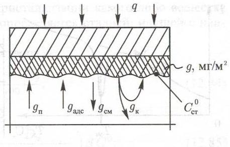 Рис.1.6. Схема потоков примеси в системе «слой отложений – водный теплоноситель». Изменение массы отложившейся на стенке примеси во времени, в общем случае, определяется соотношением количества поступившей примеси и уносом (смывом) примеси со стенки. Количество поступившей примеси за время