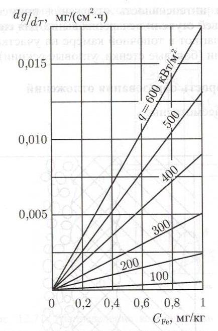 Рис. 1.21. Влияние тепловой нагрузки на скорость образования железооксидных отложений при разных концентрациях железа в воде.