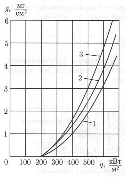 Рис. 1.25. Зависимость скорости образования медных отложений (за месяц) от тепловой нагрузки: 1- 1-ая ступень испарения; 2-2-ая ступень испарения; 3-3-я ступень испарения. При Сильная зависимость величины отложений от теплового потока приводит к тому, что максимум отложений совпадает с максимумом теплового потока (рис. 1.26). Металл при этом находится в тяжелых условиях работы.