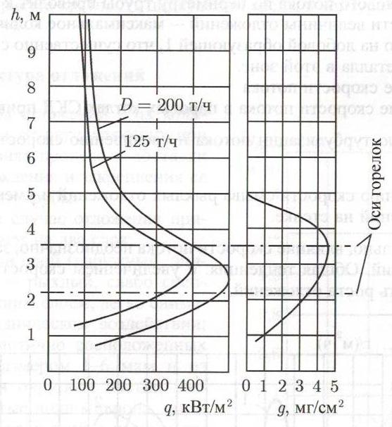 Рис. 1.27. Распределение теплового потока 4) Влияние скорости потока Увеличение скорости потока в паровых котлах СКД приводит: - к усилению турбулизации потока и увеличению скорости роста отложений; - к увеличению скорости смыва рыхлых отложений и уменьшению массы отложений на стенке. Следовательно, влияние скорости потока неоднозначно, зависит от конкретных условий. Общая тенденция: с увеличением скорости потока снижается скорость роста отложений. При докритическом давлении в прямоточных котлах основная масса примеси выпадает в зоне кризиса кипения 2-го рода (рис. 1.28). В координатах