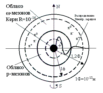 Физика элементарных частиц, при всей несуразности ее теоретической части, имеет удивительную прозрачность для понимания. Итак, автор рассмотрит структуру микромира с разбора структур нейтрона и протона. При этом, автор не согласен с тем, что нейтрон является элементарной частицей. И соответственно, автор не согласен с тем, что слабое взаимодействие является самостоятельным взаимодействием материи. Автор считает, что эффект так называемого “слабое взаимодействие” есть следствие неустойчивости структуры нейтрона в нейтринном потоке космоса. И антинейтрино не уносит часть массы нейтрона в виде энергии. В логике теории автора формула полной энергии материи E = m∙c2 не имеет никакого смысла. А то, что суммарная масса протона и электрона меньше массы нейтрона, по мнению автора, является следствием того, что при измерении массы частиц не учитывается, что гравитационное поле нейтрона экранировано, а у протона экранировано только частично. Автор рассмотрит структуру нейтрона и соответственно протона по рисунку 1. По современным представлениям, нейтрон – это сложное трехслойное образование с ядром-керном и двойной оболочкой в виде p-мезонных облачков, плотность которых убывает к их периферии до нуля. Из предыдущего анализа, автор пришел к выводу, что так называемый верхний слой - облако p-мезонов, на самом деле, является электроном. Вызывает интерес, что же тогда представляет собой нижнее облако p-мезонов? Эти частицы были обнаружены в 1947 г. С. Поуэллом, в верхних слоях атмосферы и названы пи-мезонами (p-мезоны), или пионами. Пионы рождаются в результате воздействия космических лучей на протоны и нейтроны ядер ионизированных газов и существуют около двух стомиллионных долей секунды, а затем распадаются на мюон и нейтрино или антинейтрино. А мюоны распадаются на мюонное нейтрино, электронное антинейтрино и электрон (позитрон).