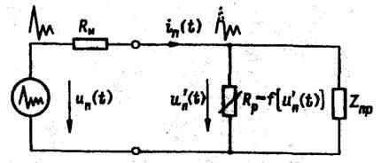 Пассивные помехозащитные устройства. Разрядники для защиты от перенапряжений. Разрядники для защиты от перенапряжений служат для ограничения переходных перенапряжений, вызванных молнией, при отключении индуктивных потребителей, разрядах статического электричества, электромагнитным импульсом ядерного взрыва и т. д. Они являются нелинейными резисторами, которые в пределах рабочего напряжения обладают высоким сопротивлением, а при перенапряжениях их сопротивление снижается. Вместе с полным сопротивлением источника помех (при длинных линиях — это волновое сопротивление Z0) они образуют делитель напряжения с нелинейным коэффициентом деления, который снижает перенапряжения до значений, меньших импульсной электрической прочности защищаемых элементов (рис. 4.17). Напряжение на нелинейном резисторе определяется как