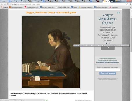Эту картину Шарден показал в Салоне 1741 года под названием "Сын мсье Ле Нуара, забавляющийся постройкой карточного домика". "Мсье Ле Нуар" был краснодеревщиком и близким другом Шардена (вероятно, еще с детства, ведь отец Шардена тоже зарабатывал на жизнь ремеслом краснодеревщика). Сюжет постройки карточного домика - один из самых популярных в жанровой живописи XVIII столетия. Достаточно сказать, что Шарден сам написал еще три картины на ту же тему. Ему, однако, было чуждо стремление большинства художников "нашпиговать" картину разного рода символами (карточный домик символизировал эфемерность человеческой жизни и тщету людских стремлений). В карточном домике он видит лишь карточный домик, детскую забаву, помогающую ему создать живой и непринужденный портрет мальчика, поглощенного своим занятием. Точно так же, отметим, и мыльные пузыри, выдуваемые малышом в картине "Прачка", вовсе не являются символом праздного время препровождения. Но здоровый взгляд на предмет не уберег Шардена от того, чтобы его работе придали смысл, которого автор в нее не вкладывал. В 1743 году гравюра с шарденовского "Карточного домика" вышла со следующей подписью: "Что надежнее - твои планы на будущее или твой карточный домик?"