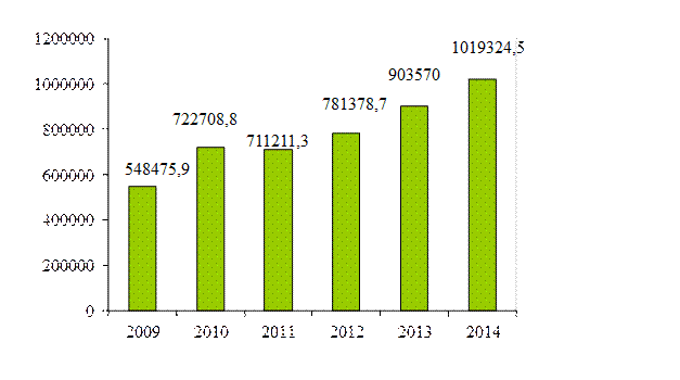 Представленные на рисунке данные свидетельствуют о том, что если в Париже на 1000 жителей приходится 159 мест на предприятиях питания, то в Санкт-Петербурге 90 мест на 1000 жителей. Использование данного норматива позволяет установить ряд важных для бизнеса положений, которые касаются уровня конкуренции. По наблюдениям ведущих маркетологов рынка гостеприимства, критическим значением обеспеченности населения посадочными местами в конкретном населенном пункте является величина равная 50%. Если этот показатель ниже, конкуренция практически не ощущается. Если величина указанного показателя колеблется в пределах 50-70 %, то уже стоит говорить о наличии конкуренции, и на этих предприятиях уже необходима маркетинговая деятельность. Когда значения показателя находятся в диапазоне 70-80%, наблюдается некий переходный период, сопровождающийся полной перестройкой отношения к гостям, управления бизнесом и другим аспектам рассматриваемой деятельности. Обеспеченность посадочными местами на уровне 80% является вторым критическим рубежом – необходимо бороться буквально за каждого гостя, поставить систему управления на современный уровень, задуматься о стратегическом управлении[95]. Согласно данных Статрегистра Росстата российский рынок ОП в 2014 году увеличился в целом на 12,8 %, и его объем составил 1019324,5 млн.рублей (рис.2).