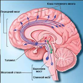 Поддержание человека в состоянии бодрствования осуществляется за счёт деятельности двух основных нейронных сетей. Одна группа нервных клеток, содержащих нейротрансмиттер ацетилхолин, расположена в стволе головного мозга (на рисунке отмеченная зелёным цветом), а вторая – в переднем мозге (отмечена красным цветом). Участок ствола мозга, отвечающий за активность, распределяет ацетилхолин по самому стволу, а также передаёт его в таламус. А участок переднего мозга, также отвечающий за активность, передаёт ацетилхолин в кору. Когда оба эти участка активированы, человек переходит к фазе быстрого сна. Для пробуждения необходима активация других групп нейронов, содержащих такие моноаминовые нейротрансмиттеры, как норэпинефрин, серотонин и гистамин (отмечены синим цветом).