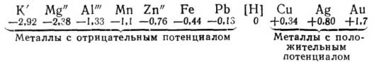 Металлы слева от водорода имеют отрицательный нормальный электродный потенциал и легко окисляются, а справа — положительный и менее подвержены окислению (благородные металлы). При погружении электродов любой пары металлов в электролит металл, стоящий левее в приведенном выше ряду, приобретает отрицательный потенциал и становится анодом, а металл, стоящий правее, —положительный и становится катодом. Электродвижущая сила гальванического элемента, состоящего из двух электродов, равна разности двух нормальных потенциалов.