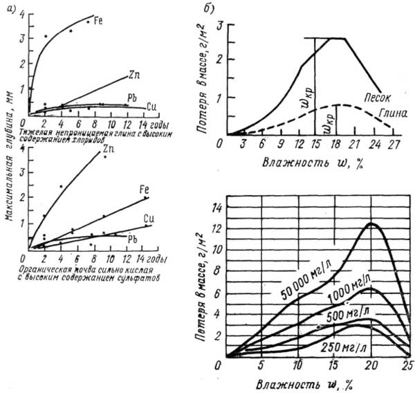 Для защиты металла от коррозии необходимо прекратить (подавить) действие гальванических элементов, что достигается наложенным током, и такой потенциал называется защитным. Разновидностью электрохимической коррозии является почвенная коррозия, т. е. разрушение подземных металлоконструкций почвенной средой. Основной вид такой коррозии — разрушение металла в почвенной среде — электролите. Кроме того, в почве может происходить коррозия, вызванная блуждающими токами и воздействием бактерий. Можно полагать, что половина всех потерь металла подземных конструкций от коррозии приходится на почвенную коррозию. Для подземных металлоконструкций блуждающие токи представляют иногда большую опасность, чем почвенная коррозия. Известны примеры выхода из строя газопроводов под действием блуждающих токов еще до сдачи их в эксплуатацию.