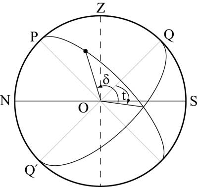 1 экваториальная система координат В этой системе основной плоскостью является плоскость небесного экватора. Одной координатой при этом является склонение δ (реже — полярное расстояние p). Другой координатой — часовой угол t. Склонением δ светила называется дуга круга склонения от небесного экватора до светила, или угол между плоскостью небесного экватора и направлением на светило. Склонения отсчитываются в пределах от 0° до +90° к северному полюсу мира и от 0° до −90° к южному полюсу мира. Полярным расстоянием p светила называется дуга круга склонения от северного полюса мира до светила, или угол между осью мира и направлением на светило. Полярные расстояния отсчитываются в пределах от 0° до 180° от северного полюса мира к южному. Часовым углом t светила называется дуга небесного экватора от верхней точки небесного экватора (то есть точки пересечения небесного экватора с небесным меридианом) до круга склонения светила, или двугранный угол между плоскостями небесного меридиана и круга склонения светила. Часовые углы отсчитываются в сторону суточного вращения небесной сферы, то есть к западу от верхней точки небесного экватора, в пределах от 0° до 360° (в градусной мере) или от 0h до 24h (в часовой мере). Иногда часовые углы отсчитываются от 0° до +180° (от 0h до +12h) к западу и от 0° до −180° (от 0h до −12h) к востоку. Прямое восхождение и склонение из-за уточного вращения небесной сферы не меняется, т.к. они отсчитываются от точек, которые сами участвуют в движении