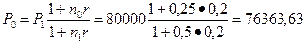 Пример 1. Согласно новому финансовому соглашению платеж 80 000 руб. со сроком уплаты 6 месяцев заменяется платежом со сроком уплаты 3 месяца. Найдите величину нового платежа, если используется простая процентная ставка 20 % годовых. Решение. Пусть P1 = 80 000 руб., r = 0,4. Считая, что год содержит 360 дней и каждый месяц - 30 дней, полагаем n1 = 0,5 года Полагая n0 = 0,25 года и учитывая, что n0 < n1, по формуле получим: P0 = 80 / (1 + (0,5 – 0,25) • 0,2) = 76 190 руб. Этот же результат можно получить, и не пользуясь формулой, а составив для данной конкретной ситуации уравнение эквивалентности, руководствуясь принципом финансовой эквивалентности. В соответствии с этим принципом величина платежа Ро должна быть такой, что, получив через 3 месяца (nо = 0,25 года) P0 и инвестировав эту сумму под простую процентную ставку r = 0,2, кредитор через время n1 – n0 мог бы получить сумму P1 = 80 тыс. руб. Таким образом, получим уравнение: P1 = P0 • (1 + (n1 – n0) • r), в котором неизвестной величиной будет P0 Обратим внимание на следующий факт. Если не применять принцип финансовой эквивалентности, а просто воспользоваться равенством приведенных стоимостей (на начальный момент времени) этих платежей, т.е. соотношением то платеж P0 будет равен: