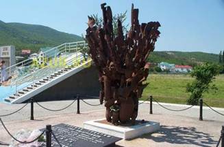 Мемориальный комплекс в Новороссийске «Долина смерти» В местах самых ожесточенных боев на Малой Земле в апреле 1943 года расположен мемориальный комплекс «Долина смерти» в Новороссийске. В его состав входят несколько памятников: «Демонстрационная карта-схема», «Взрыв». «Колодец жизни» «Передний край» и мемориальные знаки «Командный пункт 8 гвардейской Стрелковой бригады», «Командный пункт 107 стрелковой бригады». В состав комплекса входит дерево платан, посаженное Л.Н.Брежневым 6 сентября 1974 года. На стеле перед въездом памятная надпись: «По этой долине осуществляло обеспечение левого фланга войск Малой Земли боеприпасами, продовольствием и всем необходимым для жизни, ведения боя. Здесь находились единственный источник питьевой воды. Весь район противник держал под постоянным массированным огнем...». Рядом разместилось еще девять стел, рассказывающих о самых кровопролитных сражениях в апреле 1943 года, смотровая площадка, карта-макет боев в Долине смерти и на всей Малой Земле. На невысоком постаменте - оригинальный по своему решению и материалу памятник «Взрыв». Он выполнен в виде дерева из осколков бомб, снарядов и мин, вес 1250 килограммов. Именно столько смертоносного металла обрушили гитлеровцы в среднем на каждого бойца - «малоземельца». На его изготовление пошел металл, который был собран здесь же. Крупные, вырубленные в скале ступеньки ведут к закрытому густым кустарником фоту. Это - командный пункт 8-го стрелкового батальона. В неглубокой долине у Колдун-горы находится еще один своеобразный памятник мемориального комплекса - обычный колодец. В дни особенно кровопролитных боев он был одним из немногих источником питьевой воды на Малой Земле. Недаром бойцы называли его: «Источник жизни в Долине смерти». Завершает этот уникальный мемориал многотонный противотанковый "еж" поднятый на бетонный постамент и обозначающий передний край обороны Малой Земли.