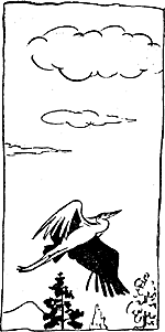 Рис. 18. Цыпленок ловит комара. Использование при одушевлении персонажей этих особенностей способствует логичному и правдивому изображению происходящего действия, которое без соответствующей подготовки трудно иногда проследить на экране в динамическом темпе рисованного или кукольного фильмов. Сохранение равновесия и правильного размещения центра тяжести корпуса в движении персонажа также необходимо для правдивого решения изображаемого действия. Моменты равновесия и перемещения центра тяжести присущи всякому действию, в котором происходит изменение в положении корпуса передвигающегося живого организма, например в ходьбе и беге, при выполнении физической работы, участии человека в спортивной игре и т.д. Эти моменты заметнее в действиях, вызывающих усиленное напряжение тела, например при переносе тяжестей, подъеме по крутому склону и т.п. Если взять, к примеру, ходьбу человека, то каждый его шаг, при котором центр тяжести тела переносится с одной ноги на другую, сопровождается для сохранения равновесия соответствующим движением рук, которое будет противонаправлено движению ног, то есть продвижение вперед правой руки будет совпадать с продвижением вперед левой ноги, а продвижение левой руки - с продвижением правой ноги. И чем энергичнее шаг, тем интенсивнее будет движение рук. Крадущиеся шаги или согнутое положение корпуса человека, стоящего на одной ноге (на которой сосредоточен вес его тела), потребуют для сохранения равновесия отведения руки далеко назад или в сторону. Перемещение центра тяжести и уравновешивающие моменты в движениях персонажа образуют соответствующую ритмическую кривую, которая в ходьбе выражается небольшим колебанием корпуса вверх и вниз соразмерно кривой движения ног в шаге. То же самое наблюдается в ходьбе и беге животных, и оно придает корпусу ощущение весомости в движении. Игнорирование этих явлений в процессе одушевления лишает персонаж жизненности и создает впечатление о его ходьбе, как о движении невесомой фигуры, плавающей в воздухе и едва касающейся земли. При одушевлении персонажей возникает проблема разработки движения одежды, которая при различных действиях персонажа меняет свою форму, как, например, сокращение рукава и образование на нем складок при протягивании руки, сползание воротника вниз при наклоне корпуса вперед, образование складок на верхней одежде при ходьбе, беге; ритмичное колебание юбки при ходьбе женщины и т.п. Неподвижное состояние одежды при различных действиях персонажей не дает нужной выразительности и снижает ощущение правдивости. Между тем, изменяя форму одежды при движении, художник получает возможность подчеркнуть и акцентировать каждое положение персонажа, делая его, таким образом, более естественным и убедительным. Изображение стихийных сил природы - грозы, бури дождя, пурги, шторма, огня - решается на основе определенных схем, представляющих разнообразные фазы движения различных начертаний в виде пятен, линий, точек, получаемых художником-мультипликатором опытным путем в результате его работы над подобными сценами. Прорисовка (чистовые рисунки компановок)