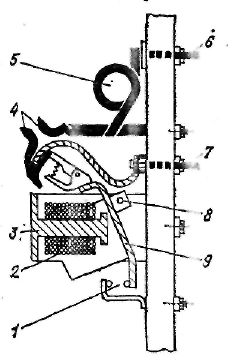 Осердя 1 електромагніту намагнічується котушками 2. Контактор — це електромагнітний апарат, призначений для частих замикань і розмикань у силових колах постійного (з напругою до 440 В) та змінного (з напругою до 660 В) струмів. Будову контактора у вимкненому стані зображено на рис. 11.7. Коли через котушку 2 пройде струм, то намагнічене осердя 3 притягне нижнє плече якоря 9. Останній повернеться навколо осі 8, при цьому нижній рухомий контакт головних контактів 4 зімкнеться з верхнім нерухомим. Струм пройде через верхній затискач 6 робочого кола, котушку магнітного дуття 5, головні контакти 4, нижній провід і нижній затискач 7 робочого кола. Одночасно замкнеться допоміжний контакт 1, який називається блок-контактом Котушка магнітного дуття призначена для прискорення гашення електричної дуги, що виникає при розмиканні головних контактів контактора. Контактори бувають одно-, дво- та триполюсні. Вони випускаються для комутації струму силою до 2500 А. Date: 2015-06-08; view: 586; Нарушение авторских прав |