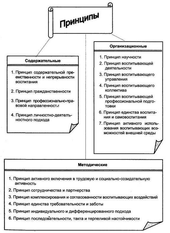 Педагогические принципы воспитания — специальная система основных, исходных требований к построению его системы, главные рекомендательные положения, реализация которых обеспечивает достижение цели и решение задач воспитания. Они — обобщенный вывод-урок из опыта воспитания, результатов научных исследований и основаны на понимании как общих, так и специфических закономерностей воспитания в условиях правоохранительной деятельности, т.е. зависимостей между действиями субъектов воспитания, средой, окружением, условиями, в которых действует и живет персонал правоохранительных органов, и воспитательными результатами. Подчеркивая роль понимания и правильного учета закономерностей воспитания, К.Д. Ушинский писал: ...Мы не говорим педагогам: поступайте так или иначе; но говорим им: изучайте законы тех психических явлений, которыми вы хотите управлять, и поступайте, соображаясь с этими законами и теми обстоятельствами, в которых вы хотите их приложить[139]. Поскольку правоохранительный орган представляет собой деловую, а не воспитательную организацию, особое значение имеют социально-педагогические закономерности и рекомендации по воспитанию сотрудников в процессе деятельности, в реальном столкновении с кипучей жизнью, а не в тиши учебных кабинетов. Воспитанность человека — продукт множества влияний и закономерных зависимостей, и воспитание его поэтому — сложнейшая педагогическая работа. В идеале она должна быть всеохватной, что практически невозможно не только по количественным причинам, но и потому, что многое неподвластно субъектам воспитания правоохранительного органа (например, находящееся на уровне высших эшелонов государственного управления и жизни всего общества). Поэтому система воспитания в нем предполагает охват важнейших закономерностей и их групп, поддающихся учету в работе с личным составом. Все такие закономерности по месту в педагогической системе воспитания и качественным особенностям находят отражение в трех группах педагогических принципов: содержательных, организационных и методических [140] (рис. 9.1).