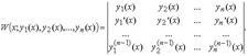 Определителем Вронского W(x; y 1(x), y 2(x),..., yn (x)) называется определитель, первая строка которого образована функциями y 1(x), y 2(x),..., yn (x) из C n -1[ a, b ], а последующие строки образованы производными от функций предыдущей строки: