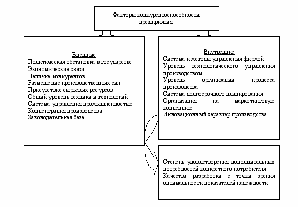 Анализ конкурентоспособности фирмы на рынке допускает определение факторов, которые влияют на отношения покупателей к фирме и ее продукции и как результат – смена части рынка фирмы. Все факторы конкурентоспособности можно разделить на внешние и внутренние