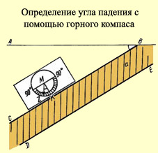 Угол падения измеряется с помощью клинометра. Компас прикладывается к линии падения клинометром вниз, отвес клинометра отпускают из фиксированного положения, и снимают отсчет по специальной шкале, проградуированной по 90 градусов в обе стороны. Важно! Т.к. линии падения и простирания перпендикулярны между собой, азимут простирания можно не измерять во всех случаях, кроме вертикального залегания слоев, а определять прибавляя или вычитая 90 градусов к азимуту падения. В случае вертикального залегания, напротив, не измеряется азимут падения, т.к. не несет никакой информации.