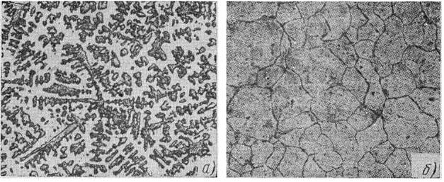 Рисунок 2 – Структура оловянной бронзы (7 % олова): а – ликвация в литом состоянии; б – однородные зерна α– твердого раствора после ковки и отжига. ×100 Механические свойства оловянных бронз достаточно высоки. С увеличением содержания олова возрастают прочность и твердость сплавов, но при этом снижается пластичность. Оловянные бронзы слабо чувствительны к перегреву и газам, свариваются и паяются, не дают искры при ударах, не магнитны, морозостойки и обладают хорошими антифрикционными свойствами. Высокие триботехнические характеристики оловянных бронз можно объяснить на основе теории самоорганизации. В поверхностных слоях оловянных бронз при трении происходит неравновесный процесс выделения олова из твердого раствора, что приводит к снижению коэффициента трения и интенсивности изнашивания. Добавки фосфора к оловянным бронзам значительно улучшают их механические, антифрикционные и литейные характеристики. Для механических свойств оптимальным является содержание фосфора около 0,5 %. При больших концентрациях фосфора бронзы охрупчиваются, особенно при горячей прокатке. Однако в литейных антифрикционных бронзах возможно до 1,2 % Р. Небольшие добавки Zr, Ti, Nb, В улучшают механические свойства и обрабатываемость давлением в холодном и горячем состояниях. Никель при его содержании до 1 % повышает механические свойства, коррозионную стойкость и измельчает зерно. Свинец значительно повышает антифрикционные свойства и обрабатываемость резанием, но снижает механические свойства. Структура оловянной бронзы с добавлением свинца изображена на рисунке 3.