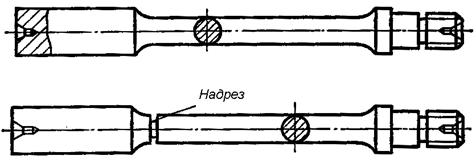 Рисунок 12 – Образцы для испытания на усталость по методу консольного изгиба: а – гладкий: б – с надрезом Распространенным методом испытания на усталость является изгиб при вращении. Схема испытания на машинах, работающих по методу консольного изгиба, показана на рисунке 14. Образец 1 закреплен одним концом во вращающемся от электродвигателя 3 патроне испытательной машины. Другой конец образца вращается в подшипнике, к которому подвешен груз 5. При вращении образец под действием подвешенного груза подвергается изгибу. При этом одни и те же внешние волокна будут подвергаться растяжению, а через полуоборот – сжатию и наоборот. Характер изменения напряжений при этом – синусоидальный. За один оборот напряжения от σmax через нуль изменятся до σmin, что соответствует полному циклу. Такой цикл, у которого максимальное и минимальное напряжения равны по величине и противоположны по знаку, называется симметричным.