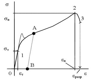 5 Модели упрочнения и разрушения при растяжении Рассмотрим процесс растяжения поликристаллического образца. На рисунке 10 изображена типичная зависимость механического напряжения σ от относительного удлинения ε при растяжении образца. Кривая имеет 3 характерных участка. Участок 0-1 соответствует упругим обратимым деформациям, когда выполняется закон Гука. Участок 1-2 соответствует необратимым пластическим деформациям; если в точке А прекратить деформацию, то состояние образца станет соответствовать точке В. Участок 2-3 соответствует разрушению образца. Часто вблизи точки 1 кривая имеет "зуб текучести" - пунктирная кривая. Его происхождение связано с точечными дефектами, которые скапливаются вблизи дислокаций, в таких местах, что уменьшаются деформации и плотность энергии вблизи дислокации, из-за чего дислокацию труднее сдвинуть при пластической деформации на новое место, где ее энергия будет больше.