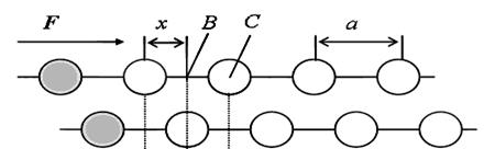 Рисунок 15 – Зависимость напряжения σ от относительного удлинения ε при растяжении образца Попытки рассчитать предел текучести без учета дислокаций приводили к завышенным на 2-4 порядка значениям. Эксперименты показывают, что пластическая деформация происходит в первую очередь вдоль так называемых плоскостей скольжения (рисунок 11). Если к верхней плоскости приложить усилие, то атомы сместятся, и появится сила упругости, равная приложенной. С этой силой будет связана энергия деформации, которая будет возрастать до тех пор, пока атомы верхней плоскости не окажутся "над" атомами нижней плоскости - в точке В. При дальнейшем смещении атомам будет уже выгоднее "спуститься" в положения С. Таким образом верхняя плоскость может проскользнуть на новое положение. Следы таких проскальзываний хорошо видны на поверхности тщательно отшлифованных монокристаллов в виде "ступенек" после пластической деформации.