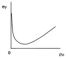 Рисунок 17 – Схематическая зависимость предела текучести от плотности дислокации В настоящее время используют ряд способов увеличения прочности материалов, большинство из них связаны с введением дополнительных препятствий движению дислокаций. Такими препятствиями являются различные дефекты: 1) выделения другой фазы; 2) точечные дефекты и их скопления; 3) большие количества дислокаций, тормозящие движение дислокаций за счет взаимодействия друг с другом; 4) ближний порядок в расположении атомов. Напряжение необходимое для развития вязкого разрушения, превышает значение предела текучести материала, используемого при расчётах прочности деталей и конструкций. Поэтому случаи вязкого разрушения в практике эксплуатации сравнительно редки. Изучение вязкого разрушения важно для определения правильных режимов многих технологических операций: прессование, волочение, глубокая вытяжка и др. процессов, связанных со значительными пластическими деформациями. Особенности пластического разрушения: 1. Большая величина пластической деформации, необходимая для распространения вязкой трещины. 2. Процесс может быть остановлен на любой стадии, если действующее напряжение снизится, его значение будет ниже напряжения течения материала перед трещиной. Закономерности разрушения в поликристаллах: 1. Шейка в виде точки - наблюдается в высокопластичных металлах с ГЦК решёткой, сужение поперечного сечения перед разрушением составляет 100%. 2. Чашечный излом, т.е. излом конус - чашечка, наблюдается в менее пластичных поликристаллических металлах и является наиболее характерным. Этот тип разрушения наблюдается наиболее часто и используется под термином «пластичное» (вязкое). При однократном нагружении при нагрузке вплоть до временного сопротивления, характерным является внутрезёренное распространение трещины, однако может быть и межзёренное. Вязким, как и другим изломам, свойственно неоднородность строения. Даже в пределах одного зерна разрушение происходит неоднородно, например, частично по плоскости скола с образованием гладкой блестящей фасетки в изломе, частично по другим поверхностям, деформированным в процессе разрушения. Макроскопический вид поверхности излома используют для оценки степени вязкости металла. В соответствии с теорией механики разрушения, вязкость является тем механическим свойством, которое наиболее тесно связанно с сопротивлением разрушению, т.е. с сопротивлением распространения трещины. Работа распространения трещины характеризует надёжность материала.