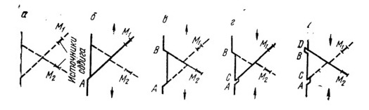 а – исходное состояние; б – работа источника М1 в прямом полуцикле; в – работа источника М2 в прямом полуцикле; г – работа источника М1 в обратном полуцикле; д – работа источника М2 в обратном полуцикле. Рисунок 18 – Механизм образования поверхностных выступов и впадин при циклическом нагружении (механизм Коттрелла – Халла) За время одного полуцикла напряжения источник М1 генерирует дислокации, образующие на поверхности ступеньку А одного направления. Затем в том же полуцикле начинает действовать источник М2 в другой плоскости скольжения, в результате работы которого на поверхности возникает ступенька В противоположного направления, а первый источник М1 смещается относительно своей плоскости скольжения. При обратном полуцикле напряжения источник М1 образует ступеньку С, не совпадающую по направлению со ступенькой А и отстоящую от нее на величину смещения, вызванного действием источника М2 за прямой полуцикл напряжения. Аналогичным образом действие источника М2 вызывает при обратном полуцикле появление ступеньки D, смещенной относительно В и не совпадающей с ней по направлению. Образовавшиеся таким образом впадины и выступы растут при последующих циклах нагружения. Механизм Коттрелла—Халла объясняет возникновение выступов и провалов в соседних полосах скольжения, однако, согласно этой модели отдельная полоса скольжения должна приводить к появлению либо впадины, либо выступа по всей длине ее пересечения с поверхностью, что не всегда подтверждается экспериментальными наблюдениями. Механизм Мотта связывает образование выступов на поверхности с циклическим движением винтовой дислокации (рисунок 17), которая за время первого полуцикла перемещается по одной поверхности полосы скольжения, а затем путем поперечного скольжения переходит к другой поверхности и движется вдоль нее при обратном полуцикле в противоположном направлении. В конце этого полуцикла дислокация снова возвращается на исходную поверхность в результате поперечного скольжения и контур ее движения, таким образом, замыкается. Следствием такого движения является перемещение объема материала, ограниченного контуром параллельно линии дислокации, на расстояние, равное ее вектору Бюргерса.