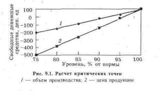 где Э i — чистый дисконтированный доход при i -м условии реализации; Pi, — вероятность реализации этого условия. Несомненно, что проведение вероятностного анализа инвестиционного проекта требует выполнения весьма значительного объема вычислений, особенно во втором случае. Методы расчета критических точек проекта обычно представлены расчетом, так называемой, точки безубыточности, применяемой по отношению к объемам производства или реализации продукции. Его смысл в определении минимально допустимого (критического) уровня производства, при котором проект становится безубыточным. Таким образом, критический объем производства представляет минимальный объем производства продукции, обеспечивающий равенство выручки от реализации продукции и издержек на ее производство. Для аналитического расчета точки безубыточности необходимо разделить все издержки на условно-переменные (связанные с объемом производства) и условно-постоянные (фиксированные) и подставить, эти значения в формулу