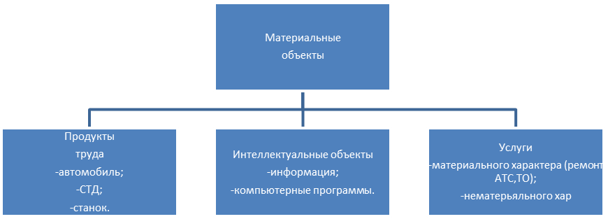 Экономическая деятельность и отношения всех участников рынка в условиях рыночной экономики строятся вокруг товара. Именно по товару, его качеству, спросу на него определяется деятельность его производителя. Фактически товар является мерой, индикатором экономической мощи государства, фирмы, производителя и индивидуального предпринимателя. Товаром является любой вид продукции произведенный для продажи. Материальные объекты относятся к товару(рис.1).