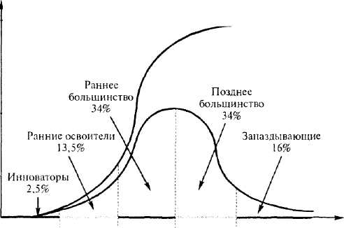 4. Реализация значимой потребности. Актуальность и очевидность удовлетворяемой потребности ускоряют диффузию. Если потребители не ощущают потребность как актуальную, инновация, ее удовлетворяющая, будет медленнее распространяться. Так, например, многие усовер- шенствованные характеристики модели копьютера могут не рассматриваться потребителем как необходимые. Поэтому компьютерные компании расширяют поставку компьютеров заказной конфигурации. 5. Соответствие ценностям, верованиям и прошлому опыту потребителей. Высокий уровень соответствия ускоряет адаптацию инновации. Это свойство было учтено при проведении деноминации в России в 1998 г. — купюры нового образца по цвету и оформлению сделали очень похожими на старые. 6. Относительное преимущество. Чем лучше видятся преимущества инновации в сравнении с существующими решениями, тем выше скорость диффузии. Цена также является относительным преимуществом. Электронная почта при интенсивном использовании имеет относительное преимущество в передаче сообщений перед факс- связью в скорости, качестве, цене и электронной форме представления сообщения. .7. Простота. Чем проще инновация в понимании и использовании, тем быстрее диффузия. Компьютерные компании стремятся преодолеть воспринимаемую сложность своей продукции путем создания обучающих программ и инструкций для конечных пользователей и продавцов. Сложность оценки потребительской выгоды инновации также замедляет процесс диффузии. 8. Обозримость. Чем доступнее позитивный эффект адаптации инновации, тем быстрее ее диффузия. Поэтому американские компании — розничные торговцы компьютерами — выставляют все модели в торговом зале в открытом доступе, чтобы посетитель мог близко и хорошо видеть продукт, понажимать на клавиши. 9. Апробируемость. Чем легче получить низкоценовую или низкорисковую пробу инновации, тем быстрее ее диффузия. Диффузия радикальной кератотомии тормозится трудностью апробации, На широкую базу апробации делают ставку производители компьютеров, устанавливающие свои новинки в университетах. Американская политика возврата в магазин компьютеров и аксессуаров в течение 30 Дней после покупки также направлена на повышение апробируемости товаров. Легко апробируемые товары — шампуни, йогурты, Моющие средства — распространяются быстрее. 10. Воспринимаемый риск. Чем больше риск, ассоциируемый потребителем с инновацией, тем медленнее диффузия. Риск может быть финансовый, физический и социальный. Риск оценивает: вероятность того, что инновация не будет функционировать как ожидается; последствия того, что инновация не будет функционировать как ожидается; возможность исправления негативных последствий и затраты на это. Так, многие потребители высоко оценивают вероятностные выгоды, предлагаемые радиальной кератотомией. Однако они воспринимают последствия неудачной операции как чрезвычайно нежелательные и необратимые и потому не принимают инновацию. Типы потребителей в диффузии инноваций По времени адаптации инновации Е. Rogers в 1962 г. разделил всех потребителей на 5 групп [Assael, 1995, p. 683]: инноваторы (innovators), ранние освоители (early adopters), раннее большинство (early majority), позднее большинство (late majority), запаздывающие (laggards). Распределение покупателей описывается кривой нормального распределения, или S-кривой, ес