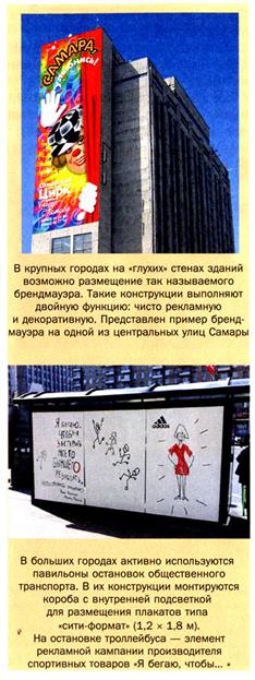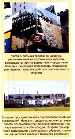 Наружная реклама — один из самых традиционных и популярных каналов распространения рекламы, используемых в России, как и в других странах мира. В российских публикациях ее часто называют «аутдоор» (от англ. outdoor — находящийся на открытом воздухе). Под этим термином подразумевается реклама, которая размещена вне помещений, вне зданий — на улице, под открытым небом. Это третий по значимости канал распространения рекламы. Значение этого канала для рекламного рынка в России достаточно велико, что подтверждается тенденцией его ускоренного развития по сравнению с другими каналами. В его структуре он занимает третье место, имея примерно 30% рынка. Наружная реклама, как и телевидение, воздействует на широкую аудиторию, но ее можно легко локализовать, что приводит к частичной избирательности аудитории. Рекламисты используют этот канал распространения рекламы в следующих случаях: • поддержка экспансии фирм на каком-либо рынке, укрепление их позиций; • поддержка действий дилеров по проведению активных промоушн-кампаний; • возможность выполнения поставленных медийных целей, а именно: охват широкой аудитории, достижение высокого показателя OTS {Opportunity to See — частота контактов с рекламным обращением), сильное воздействие на потенциальную аудиторию и достижение реального увеличения уровня продаж; • получение максимальных результатов охвата широкой аудитории рекламными обращениями в нужном месте и в нужное время при оптимальном соотношении «цена — эффективность»; • увеличение показателя как корпоративной узнаваемости, так и узнаваемости торговых марок среди широкого круга целевой аудитории (постоянных, а также потенциальных потребителей);