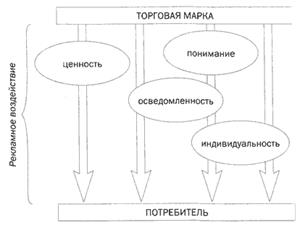 Знание торговой марки — ключ в работе с потребителем, оно складывается из осведомленности о ней, понимания ее свойств, характера индивидуальности и ценности. Именно через эти характеристики реклама товара влияет на целевые группы, на потребителя (Рис. 4.1).