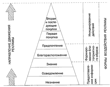 Первое направление. Модель хорошего знакомства. Предполагается, что знакомство потребителей с понравившимися товарами создает именно реклама. При этом предпочтение к товару возникает просто вследствие самой рекламы, без когнитивной деятельности со стороны потребителя. В случае, когда потребители не воспринимают рекламу в целях получения большого объема информации, очень важно частое повторение рекламы. Если рекламу склонны воспринимать с легкостью, не вникая в ее суть глубоко, частое повторение может повлечь за собой предрасположенность к рекламируемому товар) просто потому, что она отложилась в подсознании и вызывает чувства чего-то близкого и удобного, стоящего доверия. И хотя отдельные рекламные обращения несут мало информации, они все же эффективно влияют на изменение отношения к товару, особенно при их частом повторе. Реклама популярных марок нужна для усиления их предпочтения, и одним из способов является использование напоминающей рекламы. Модель хорошего знакомства объясняет, почему у людей возникает положительное отношение к знакомым маркам, даже и эти люди фактически ничего не знают о них. Такое состояние потребителя, когда он сталкивается с предметами, которые раньше неоднократно видел, называется ощущением знакомства (перцептивным состоянием). Второе направление. Модель, учитывающая степень вовлеченности потребителя в рекламу. Совершенно иное воздействие на потребителя оказывает реклама, которая строится с позиций вовлеченности. В зависимости от степени вовлеченности потребителя — низкая она или высокая, цели рекламы меняются. Исследования показали, что в ситуации высокой вовлеченности, т.е. когда потребители ищут рациональные выгоды, рекламисты должны ставить для себя целью демонстрацию выгод товара через содержание рекламного сообщения, поскольку только это и может изменить поведение потребителя. Однако в ситуации низкой вовлеченности нужно, скорее, нацелиться на создание максимальной осведомленности о товаре как первичной цели, чем на аргументы, усиливающие отношение потребителей именно к этой торговой марке как лучшей. В ситуациях низкой вовлеченности (например? в телевизионной рекламе) последовательность рекламных влияний на потребителя выглядит следующим образом: